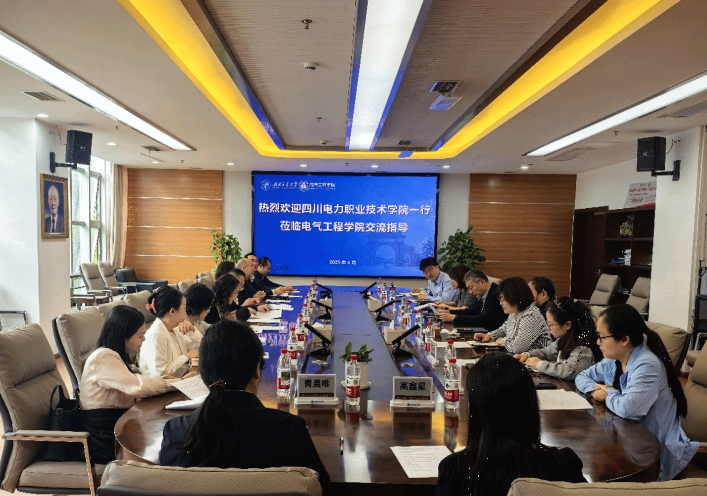 2025年4月16日上午,四川电力职业技术学院一行到学院开展交流座谈。四川电力职业技术学院党委书记杜兵,三级职员王薇,副总政工师、党委党建部(党委宣传部)主任、党支部书记李静等,以及电气工程学院党委书记王斌,党委副书记、纪委书记、副院长王轶,党委副书记邢晓鹏,教学工作主管韩莹,团委书记张异等参加会议,王轶副书记主持会议。