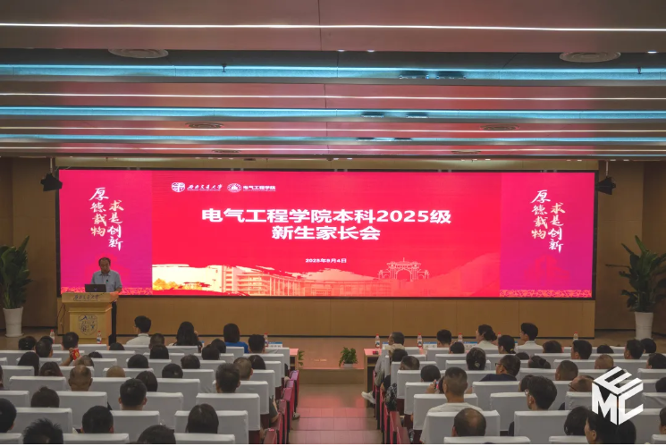 9月4日晚,电气工程学院2025级本科新生家长会于犀浦校区图书馆一号报告厅举行。电气工程学院党委书记王斌,党委副书记邢晓鹏,教学工作主管韩莹,团委书记张异,本科2025级辅导员宋治东、欧阳诗姝、何予诺、管烊堃及本科新生家长参加会议。会议由邢晓鹏副书记主持。