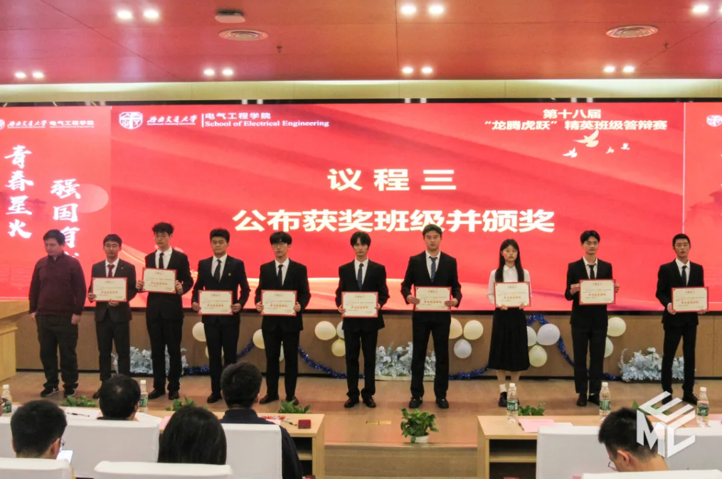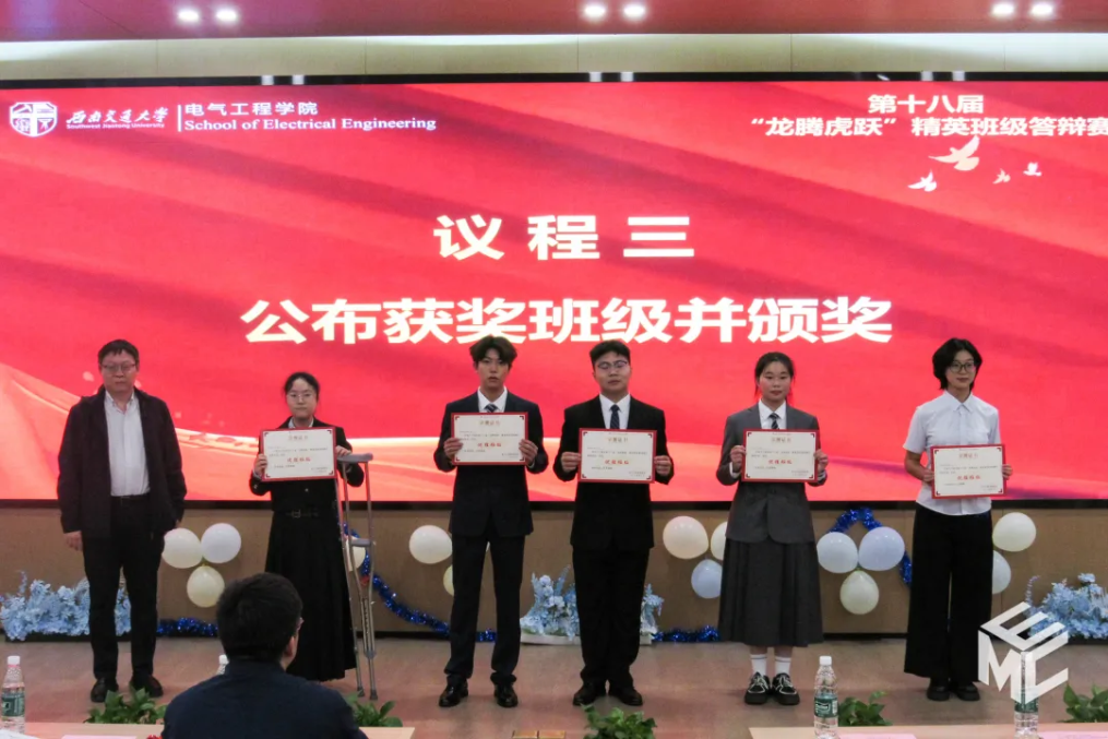 学院领导和老师为获奖班级颁发荣誉证书和奖杯。至此西南交通大学电气工程学院第十八届“龙腾虎跃”精英班级答辩赛圆满结束。
