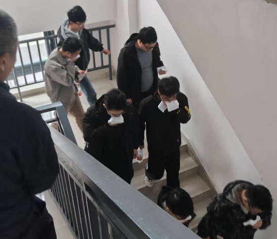 理论培训环节结束后进行了应急疏散演练。随着解绍锋副院长宣布演练开始,浓烟警报中,全体师生用湿毛巾掩住口鼻,低姿弯腰,从安全通道快速、安全、有序地疏散至电气馆外的开阔地带。整个演练过程组织严密、秩序井然,展现了师生们良好的应急素养。