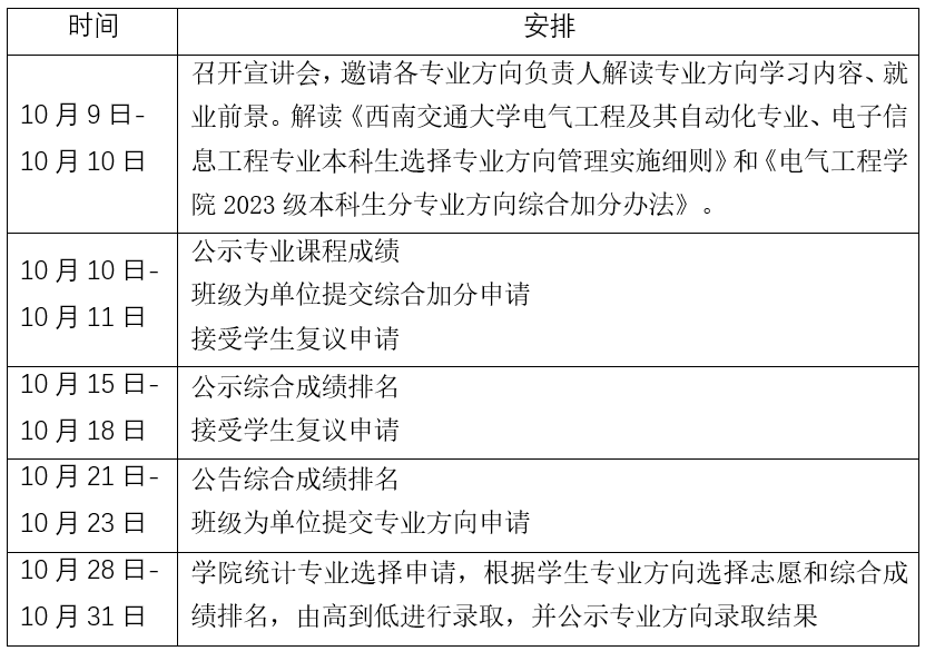 根据教育部《普通高等学校学生管理规定》、《西南交通大学本科生学籍管理规定》和《西南交通大学电气工程及其自动化专业、电子信息工程专业本科生选择专业方向管理实施细则》(以下简称“细则”,见附件1),为做好电气工程学院(以下简称学院)本科2023级电气工程及其自动化专业和电子信息工程专业本科生选择专业方向工作,现将有关事项通知如下: